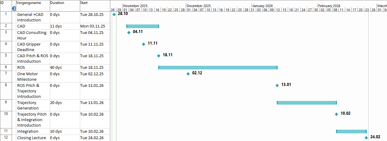 | Mode of the Lab Course | Students work in teams of three, which are formed during the kick-off workshop. Each team can book individual time slots in the lab space. The schedule for the current semester is shown below.![]() |